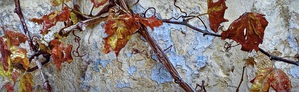 2023Dubbele fotokaart (13x19 cm incl envelope) van het kunstwerk Druivenrank. .Formaat afbeelding 7,5 x19 cm orgineel kunstwerk is een druivenrank in herfstkleur voor een muur (de ware wijnstok). Mixed media, textiel, stikwerk en handgeborduurd