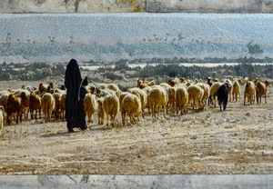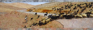 2023Dubbele fotokaart (13x19 cm incl envelope) van het kunstwerk Herder. .Formaat afbeelding 8 x19 cm orgineel textielkunstwerk van een kudde met herder onderweg in Marokko